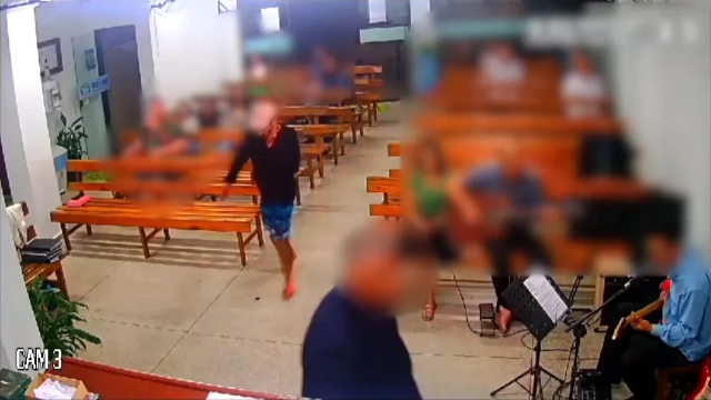 Nas imagens, é possível observar o momento na igreja, tinha algumas pessoas presentes no culto, por volta das 20 horas. Enquanto os músicos estavam no meio de uma apresentação, um homem utilizando um boné rosa surge, demonstrando dificuldade ao andar, e avança em direção à parte dianteira da igreja.