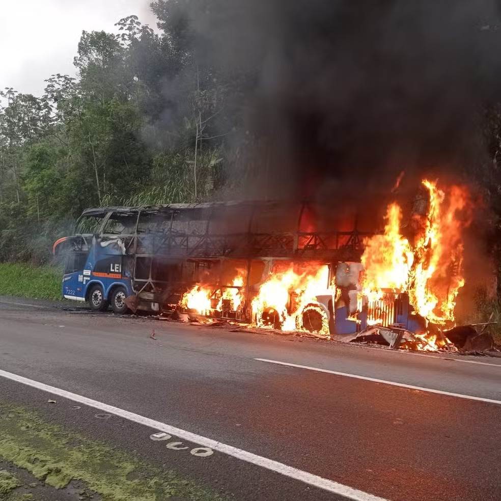 Um homem incendiou um ônibus de turismo com 44 passageiros e um animal de estimação a bordo, no km 497 da Rodovia Régis Bittencourt, na altura de Cajati, interior de São Paulo. O caso aconteceu na manhã desta sexta-feira (22). O ônibus ficou completamente destruído, mas ninguém se feriu no episódio.