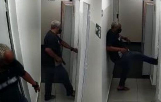 Uma sequência de fotos mostra quando o policial aposentado de 55 anos tentou "caçar" no trabalho a ex-mulher horas depois da audiência de divórcio, em Sorocaba (SP).