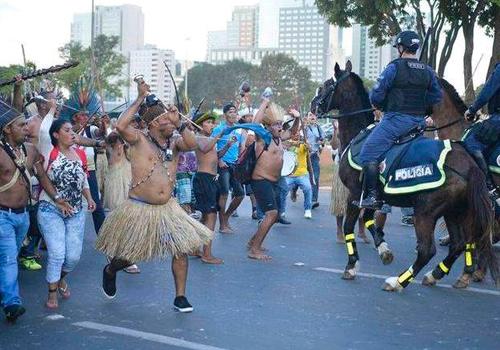 Mais cedo, um grupo com cerca de 300 índios fizeram o protesto em frente aos principais símbolos do poder em Brasília. Eles se reuniram em frente ao Palácio do Planalto e bloquearam as pistas da Esplanada dos Ministérios, principal via do centro da capital federal.