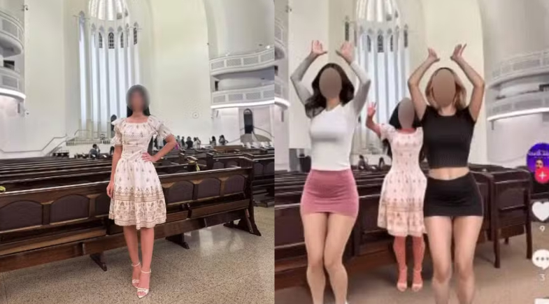 Outra jovem relatou ter sido alvo do mesmo tipo de montagem. No caso dela, o influencer usou uma foto em que ela aparece de blusa de mangas compridas e saia longa, apoiada no banco da igreja, e criou um novo vídeo.
