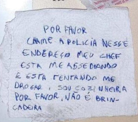 "Por favor, chame a polícia nesse endereço. Meu chefe está me assediando e está tentando me drogar. Sou cozinheira. Por favor, não é brincadeira", escreveu a jovem no bilhete.