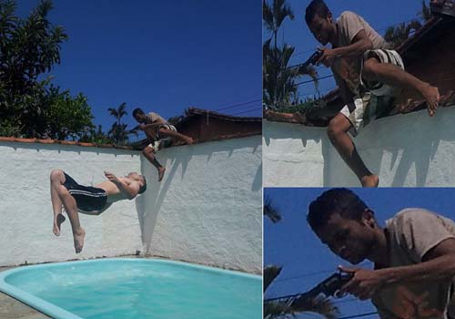 Um ladrão pulou o muro de uma residência, no dia 18 de janeiro, onde estavam oito jovens na Praia do Pernambuco/Guarujá. Os jovens tiravam fotos à beira da piscina, quando flagraram a ação do bandido.