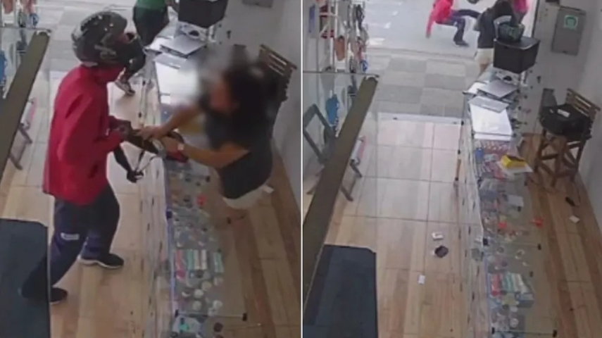 Na tentativa de escapar, o assaltante é barrado pela vendedora, que chega a empurrá-lo da motocicleta. Subsequentemente, diversas pessoas se unem para agredi-lo na calçada. Diante da situação, a própria funcionária apela por calma: "Não faz isso, pelo amor de Deus. A polícia está ali, chama a polícia".