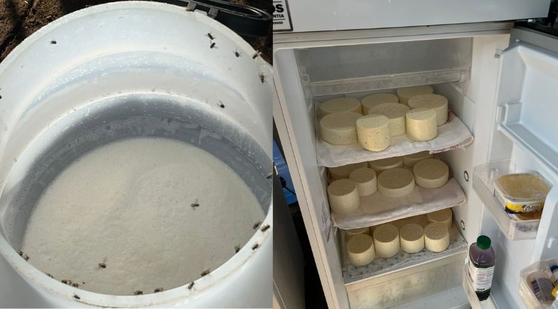 Leite e queijos foram encontrados em condições precárias, com presença de moscas e medicamentos no local, na manhã desta quinta-feira (6), em uma propriedade na zona rural de Rosário Oeste (MT), durante uma operação de combate ao comércio irregular desses produtos. Segundo a Polícia Civil de Mato Grosso, as vacas estavam sendo ordenhadas de forma ilegal.