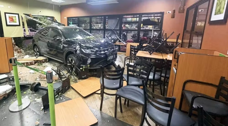 A Polícia Militar informou que, no local, constatou o veículo totalmente no interior do estabelecimento, com a parede da lanchonete ao chão.
