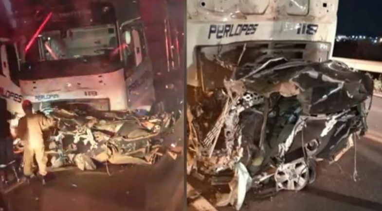 O impacto da batida foi tão violento que o automóvel partiu ao meio. Uma das partes ficou às margens da rodovia, enquanto a outra permaneceu presa à parte frontal do caminhão.