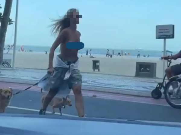 As imagens mostram a mulher, que não teve a identidade divulgada, de topless passeando com dois cachorros na orla da praia. Na sequência, outra foto mostra um guarda municipal segurando as mãos da mulher com os braços para trás.
