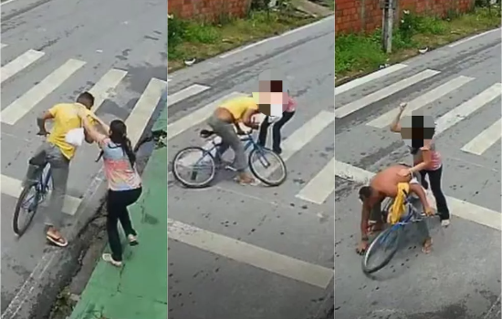 Uma mulher derrubou um criminoso da bicicleta e deu murros nas costas do suspeito para evitar que o celular fosse levado durante um assalto na Rua Barão de Ibiapaba, no Centro de Caucaia, na Região Metropolitana. O caso aconteceu na sexta-feira (8).