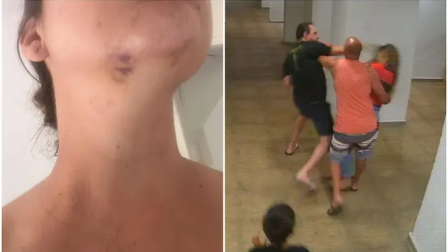 Em seguida, o agressor - que está sendo acalmado por outros moradores do prédio - volta e dá um chute na cabeça de Liana, que desmaia e fica alguns minutos desacordada. Na delegacia, ela exibiu os hematomas causados pelo chute de Michel Lapa.
