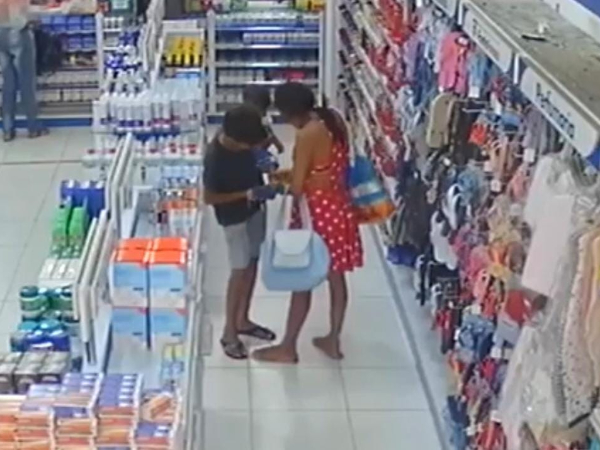 Ela observa algumas sandálias, pega um par e pede ajuda ao garoto para concluir o furto. Logo em seguida, a criminosa coloca os produtos rapidamente entre as pernas e disfarça com a chegada de uma funcionária.