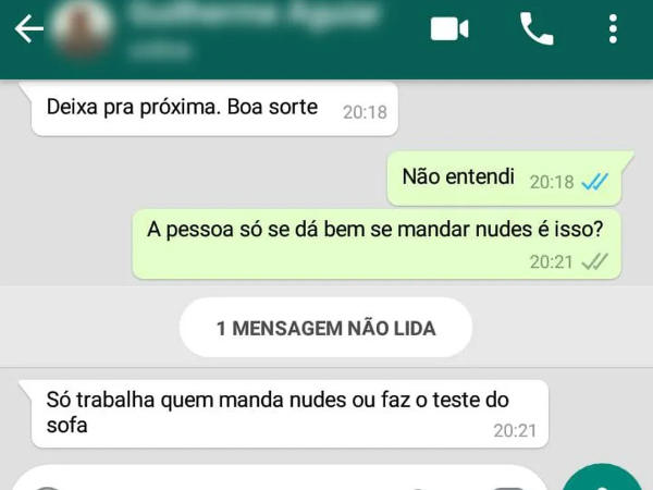 Tatiane conta que não esperava a mensagem e que foi pega de surpresa. "Estávamos conversando, ele estava marcando a entrevista e, do nada, já pediu um nude e apagou. Foi muito rápido e repentino."