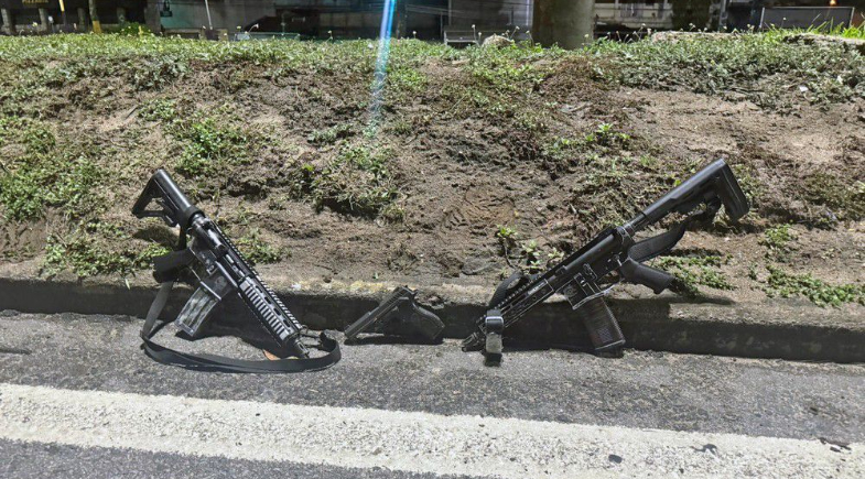 Dentro do carro dos suspeitos, policiais encontraram armamento de guerra. Foram apreendidos dois fuzis, uma pistola e granadas.