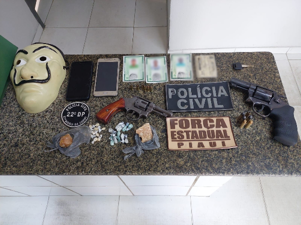 Foram apreendidos duas armas de fogo, munições, máscara, drogas e ainda um cofre, com certa quantidade de dinheiro, possivelmente proveniente do tráfico de drogas.