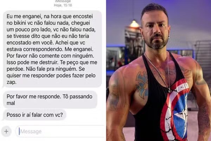Por mensagem de texto, o personal trainer Bruno Fidelis, suspeito de importunação sexual contra uma aluna, pediu que ela não contasse a ninguém sobre o incidente para não prejudicá-lo. Segundo o delegado Alex Miller, a vítima relatou que, durante uma avaliação física, o personal afastou o biquíni dela, acariciou seus seios e tentou beijá-la.