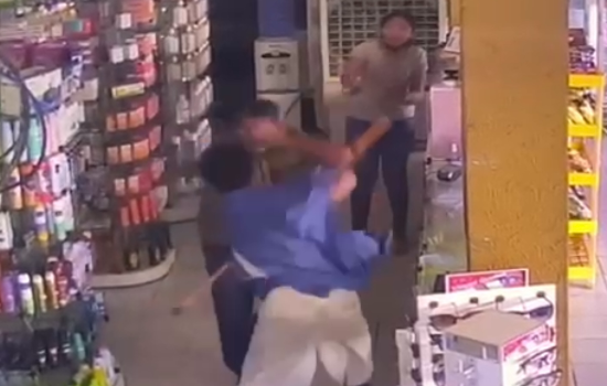 Durante a briga, objetos chegam a cair das prateleiras e outros funcionários aparecem usando bancos de madeira para agredir o invasor. Após o episódio, o homem saiu da farmácia sem levar nada.