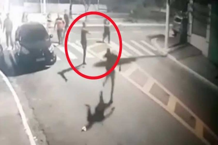 Imagens de uma câmera de monitoramento mostram a vítima tentando fugir enquanto é perseguida por um homem apontando a arma para ele e efetuando os disparos.