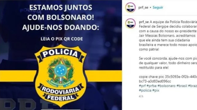 A mensagem divulgou um link para o depósito e ressaltou que “a equipe da PRF de Sergipe decidiu colaborar com a causa”, porque acredita que Bolsonaro “merece todo nosso apoio como pátria”. Na manhã de quinta-feira, a reportagem tentou acessar o QR Code indicado no perfil, mas a chave PIX já estava registrada como inexistente. Em uma entrevista, o diretor-geral da PRF, Antônio Fernando Oliveira, revelou que o perfil havia sido alvo de um ataque. Ele afirmou: "Estamos trabalhando para resolver junto às áreas técnicas".