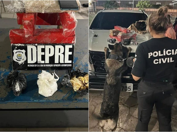 A Polícia Civil do Estado Piauí, por meio da Delegacia de Prevenção e Repressão a Entorpecentes – DEPRE, com o apoio do seu Núcleo de Operações com Cães, durante a quinta-feira (16), realizou ações na cidade de Floriano, na BR-230, com abordagens a veículos de transporte de passageiros, cegonhas e caminhões, oportunidade em que foi apreendida uma caixa contendo 7 tabletes de maconha, 2 invólucros médios de cocaína e 1 invólucro médio de “crack”, além de realizada a prisão em flagrante de duas pessoas de iniciais R.R. da S. e J.R.S de S.