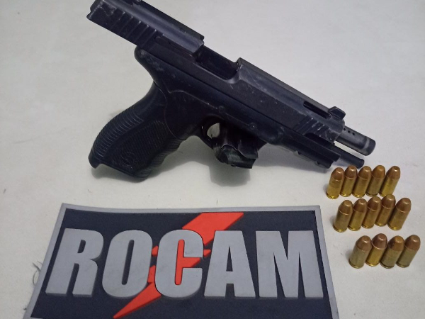 Foram apreendidas 14 munições intactas, além de uma pistola da marca Taurus, modelo PT 24/7 Pró LS.