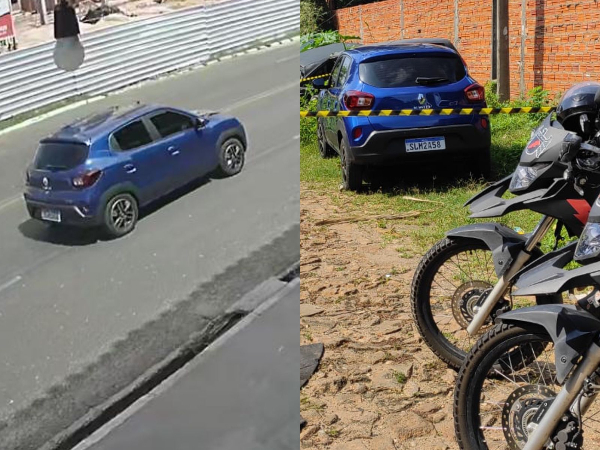 A foto mostra um veículo modelo Renault Kwid azul na avenida Homero Castelo Branco logo após o crime. De acordo com informações extraoficiais, o carro utilizado pelos bandidos foi roubado no dia 11 de janeiro deste ano.