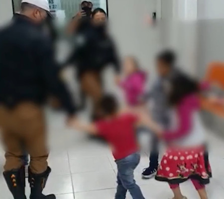 Enquanto aguardavam o Conselho Tutelar para dar encaminhamento às crianças, os policiais decidiram entreter elas, com danças e brincadeiras.