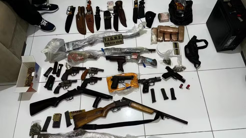 A Polícia Civil, integrando a operação, efetuou a prisão em flagrante de diversos armamentos de fogo, muitos deles provenientes de apreensões policiais, além de munição e aproximadamente 3 kg de substância suspeita de ser entorpecente. Outros objetos encontrados na casa de um dos suspeitos serão examinados.