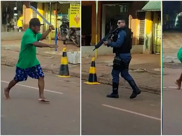 O caso aconteceu por volta das 17h desta sexta-feira (13) no município de Arame, a cerca de 480 km de São Luís. Nas imagens, o homem aparece com um facão e ameaça dois policiais dizendo 'pode atirar' enquanto vários moradores observam.