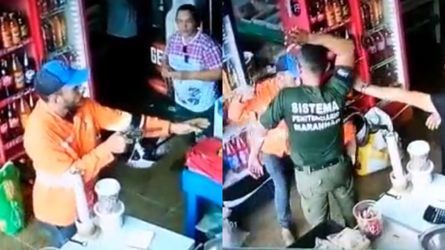 Ainda de acordo com a câmera de segurança, o suspeito, que ainda não foi identificado, rouba os utensílios do comerciante, enquanto os clientes caminham para o corredor. Neste momento, um Policial Penal do Maranhão entra no estabelecimento, flagra o assalto, não demonstra reação e tenta sair.