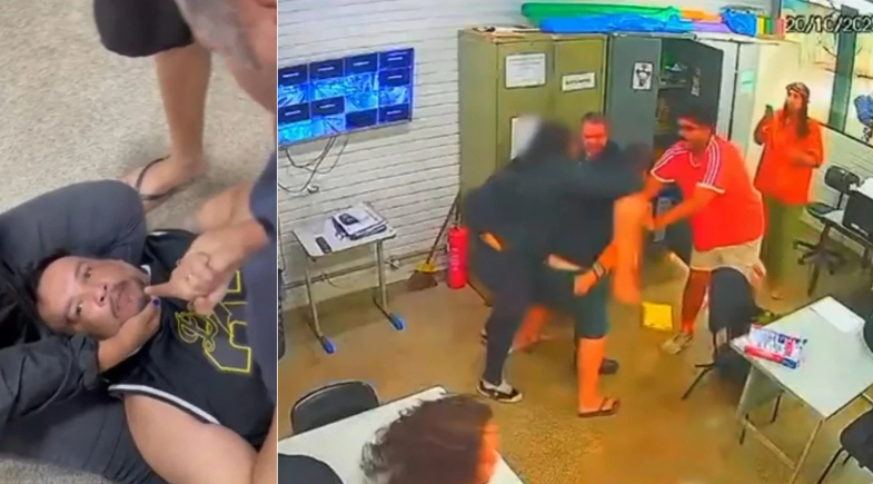 Câmeras de segurança da escola registraram o momento em que o homem, identificado como Thiago Lênin Sousa, entra na sala de coordenação e dá uma sequência de socos na cabeça do professor. A vítima tenta se proteger enquanto outros funcionários tentam conter o agressor.