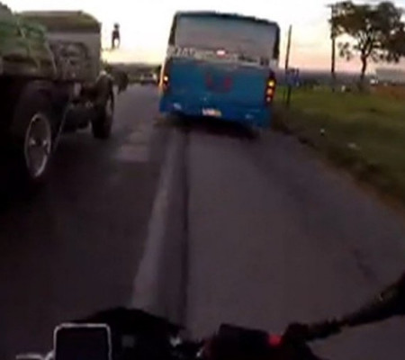O vídeo mostra ainda que o motociclista chega a ultrapassar um ônibus pelo acostamento. O acidente acontece logo em seguida, quando um segundo ônibus aparece parado no acostamento e um caminhão ao lado, impedindo a passagem da moto, que bate na traseira do veículo.