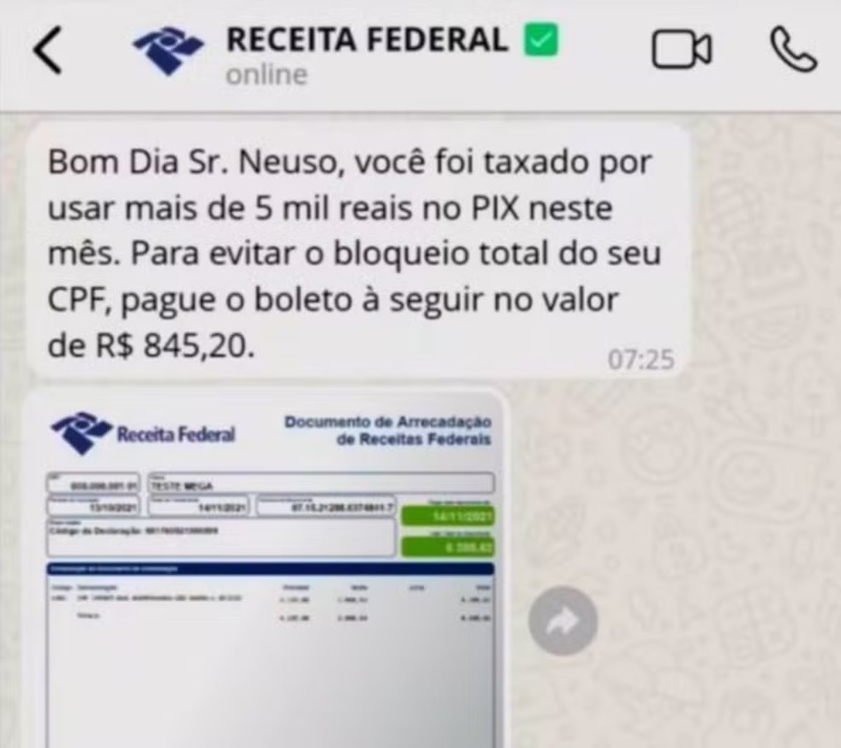 A Receita Federal alertou nesta sexta (10) sobre um golpe nas redes sociais envolvendo cobranças falsas de taxas sobre transações PIX acima de R$ 5 mil, com criminosos exigindo pagamento via boleto.