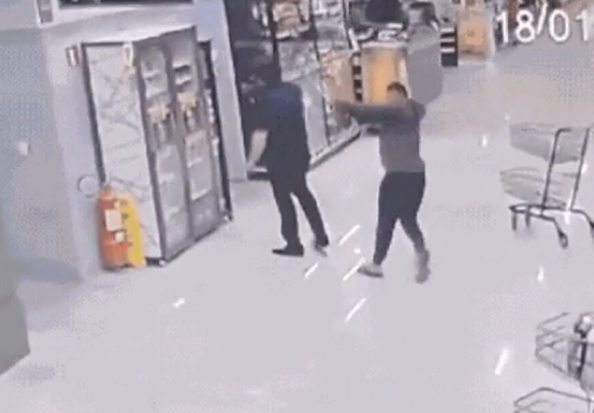 Imagens de segurança registraram o momento em que o agressor entrou no estabelecimento, pegou uma pá em uma prateleira e atacou o gerente na cabeça por trás, deixando-o inconsciente. Em nota, o supermercado informou que está apurando o caso e permanece à disposição para esclarecimentos.