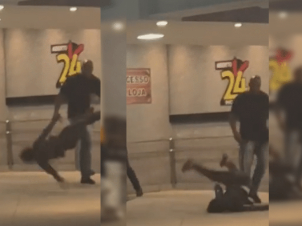 O vídeo mostra um dos seguranças dando uma rasteira na mulher, fazendo ela virar de cabeça para baixo. Depois, eles gritam para ela "vazar" e nunca mais voltar ao supermercado