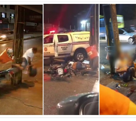 Em alta velocidade, o suspeito perdeu o controle da motocicleta e colidiu violentamente contra um poste. Gravemente ferido, com suspeitas de fraturas, ele foi encostado pelos PMs no poste.