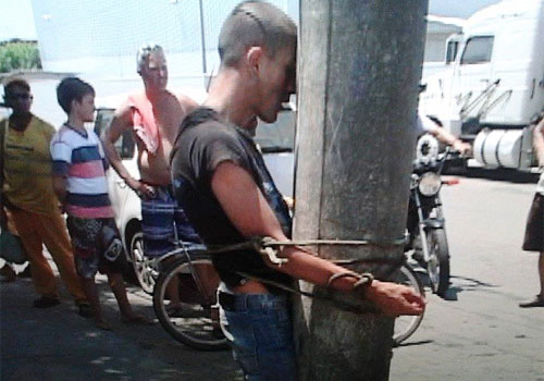 Suspeito é amarrado a poste após assalto em lanchonete com amigo