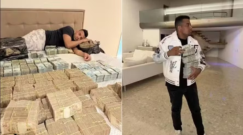 Imagens divulgadas pela investigação mostram TH deitado em uma cama coberta por cédulas de dinheiro.