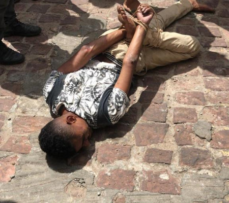 O suspeito chegou a ser amarrado com uma corda nas mãos e um dos pés.
