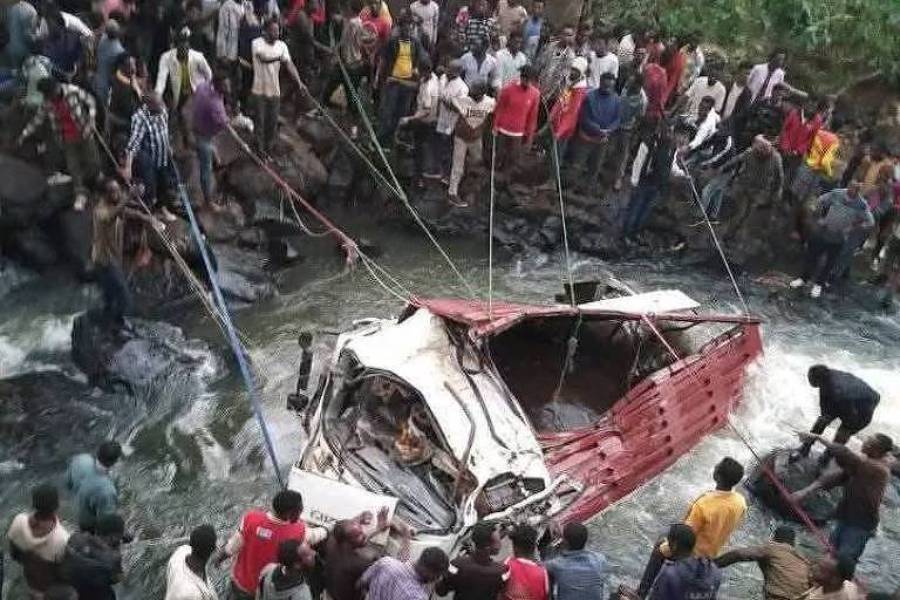 O órgão de saúde de Sidama divulgou imagens do acidente em que é possível ver várias pessoas ao redor do caminhão tentando retirar o veículo do rio e resgatar as vítimas.