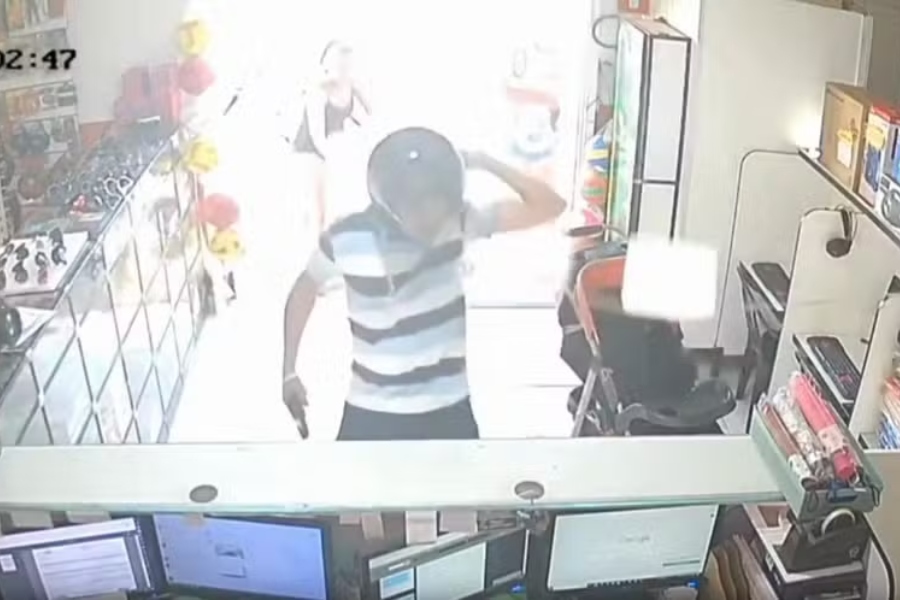 Câmeras de segurança registraram o momento em que o homem invadiu a loja onde a ex-namorada trabalha. Nas imagens, é possível vê-lo de capacete e com a arma em punho, ordenando que todos os clientes saíssem do local. Havia crianças na loja, que choraram e gritaram durante a ação.