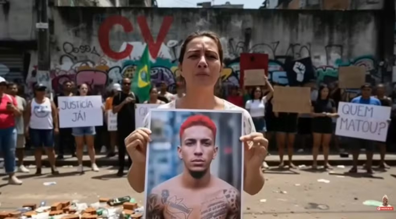 Publicado no YouTube no domingo (2), o vídeo ultrapassou 530 mil visualizações em poucos dias. Intitulado “‘Meu filho escolheu caminho errado! Eu avisei’: Mãe de traficante morto na operação do Rio fala tudo”, o conteúdo mostra uma mulher segurando um cartaz com a foto de um jovem, enquanto ao fundo outras pessoas exibem cartazes semelhantes. A mulher afirma: “Meu filho estava errado. Ele escolheu o caminho errado”. Na descrição, o vídeo se apresenta como um relato comovente de uma mãe que reconhece os erros do filho e elogia as forças de segurança — apenas depois é exibido um pequeno aviso de que se trata de uma dramatização.