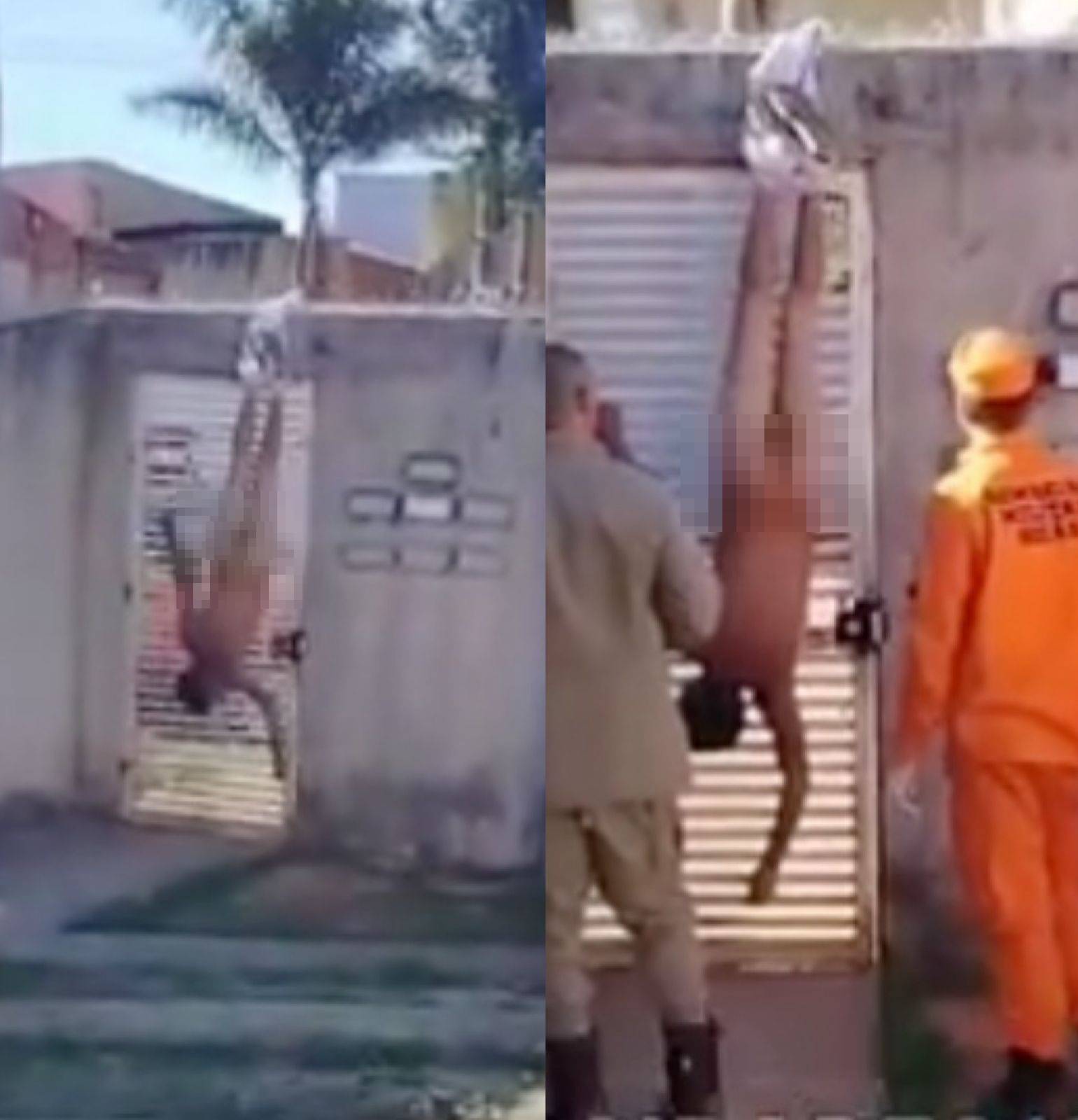 Um homem ficou pendurado pelas calças no alto do muro de um condomínio em Águas Lindas de Goiás. Segundo moradores, ele aparentava estar embriagado e procurava por sua ex-companheira, que não reside mais no local.
