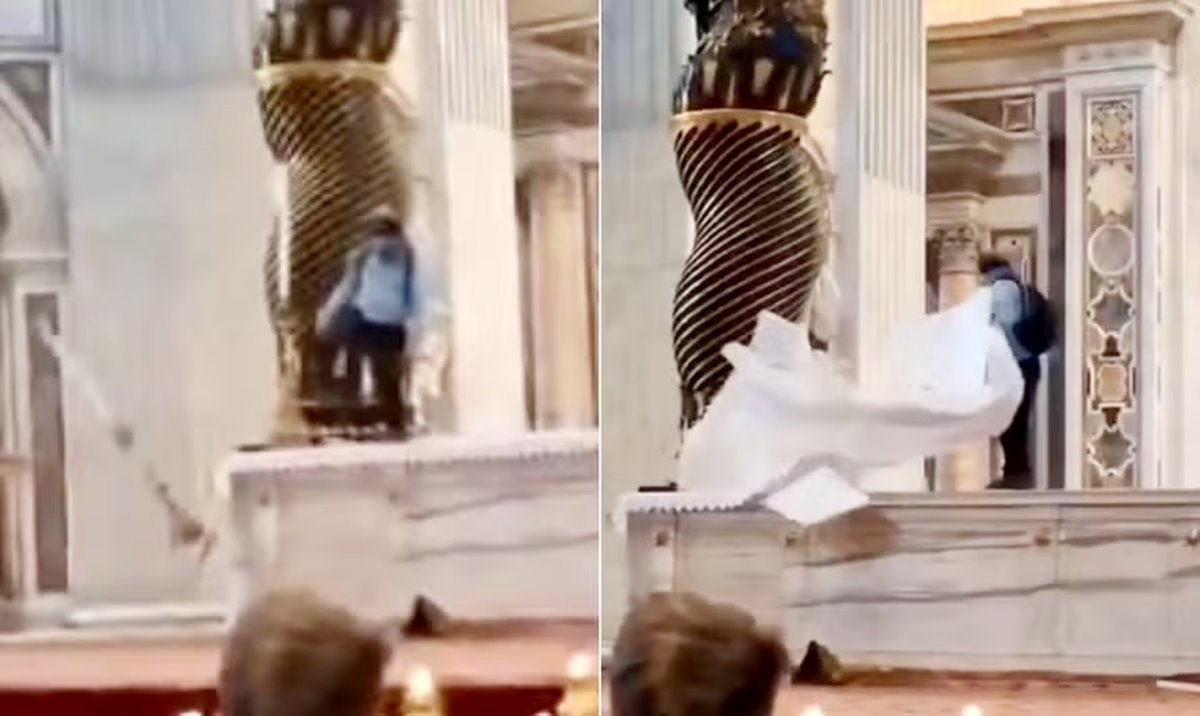 Nesta sexta-feira (7), um homem subiu no altar da Basílica de São Pedro, no Vaticano, e derrubou seis candelabros valiosos antes de ser detido. O agressor, de origem romena, foi preso por membros da segurança do Vaticano, conforme informaram as agências de notícias AGI e Ansa.