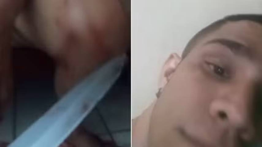 "Olha aí que essa mulher merece. Olhem o sangue. Eu aqui com a faca na mão. Matar ela aqui. Cadê, se mostra aí", diz o agressor, enquanto filma a mulher.