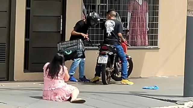 Ao tentarem remover um caixote de entrega da moto, ela cai no chão. Nesse momento, uma mulher sai da loja e um dos assaltantes aponta uma arma para ela. O filho dela surge por trás, empurra-a e ela cai no chão, suplicando para que o veículo não seja roubado.