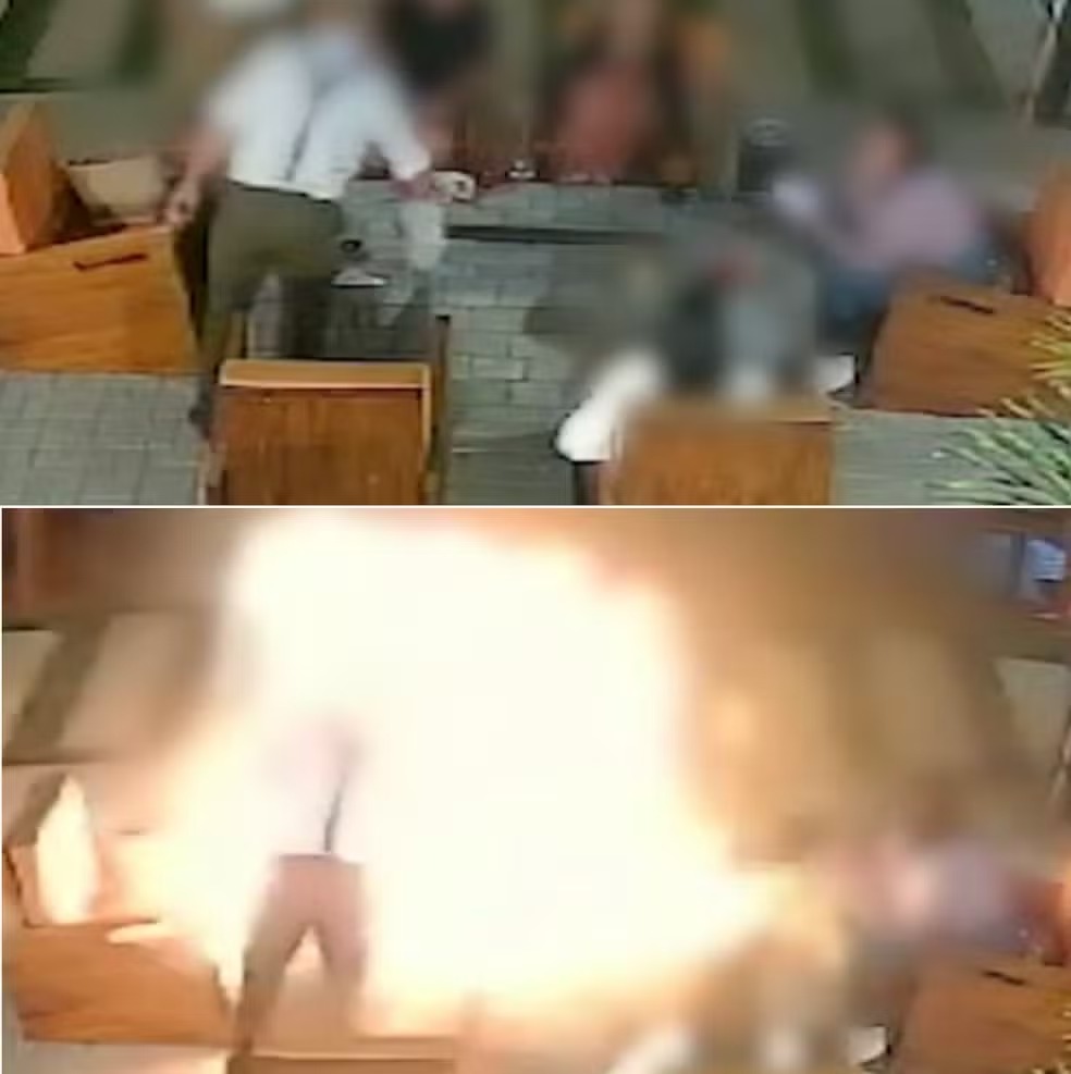 O QUE AS IMAGENS MOSTRAM - O vídeo da câmera de segurança mostra que os cinco clientes estavam em volta da mesa, próximo a entrada do restaurante no ambiente externo. Antes da explosão, o garçom chegou a colocar uma vasilha em cima da mesa. Em seguida, ele pegou a garrafa de álcool e derramou na lareira, provocando a explosão e o início das chamas.