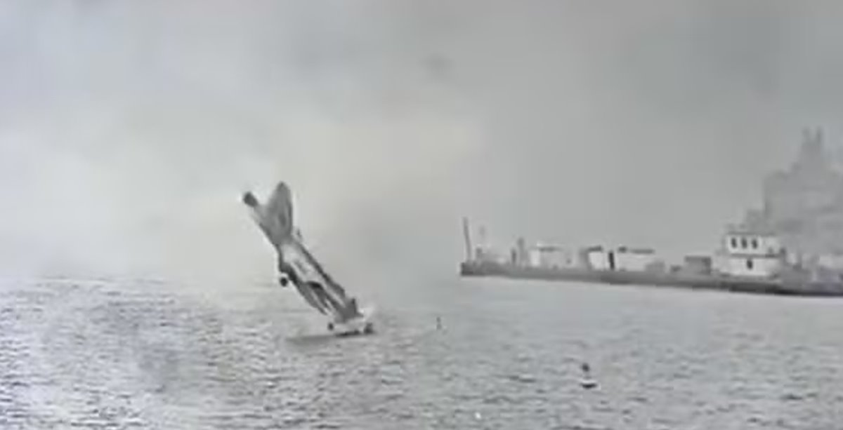 Momento em que um avião militar americano caiu na Baía de San Diego, na Califórnia | Foto: Reprodução redes sociais