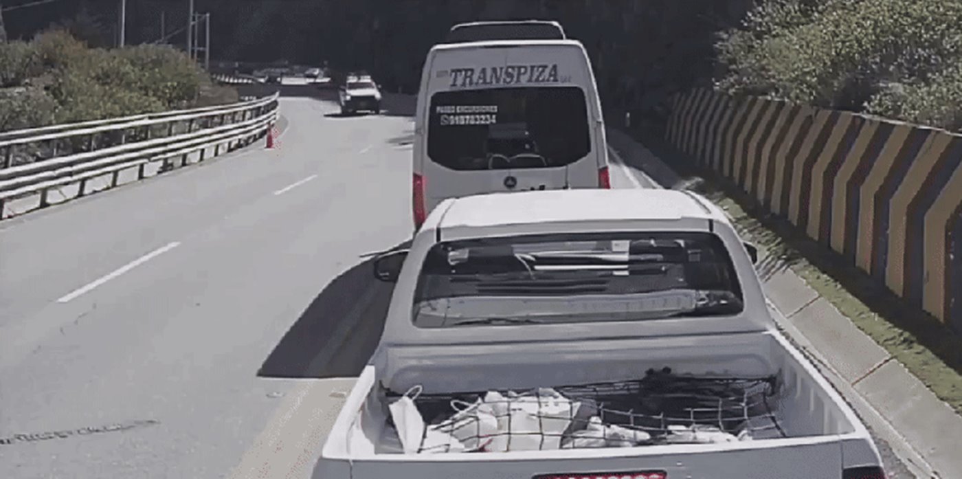Na gravação publicada nas redes sociais, dois veículos brancos, uma caminhonete Toyota Hilux e uma van, estão parados na estrada enquanto outros seguem em sentido contrário. Em seguida, uma pedra gigante cai do morro e atinge a cabine da caminhonete, que ficou destruído e capotou após o impacto.