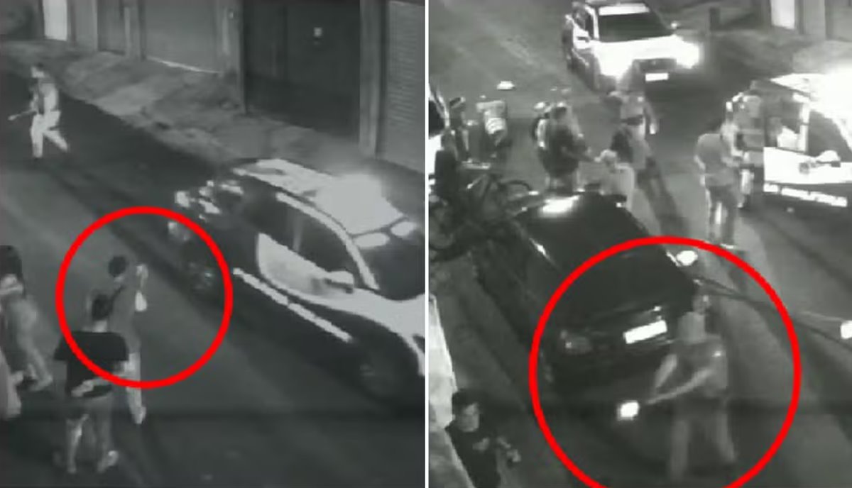 Nas imagens, é possível ver a chegada de uma viatura ao local, com dois policiais descendo e iniciando uma discussão com várias pessoas presentes na via. Um dos policiais já desembarca do veículo com a arma em punho.