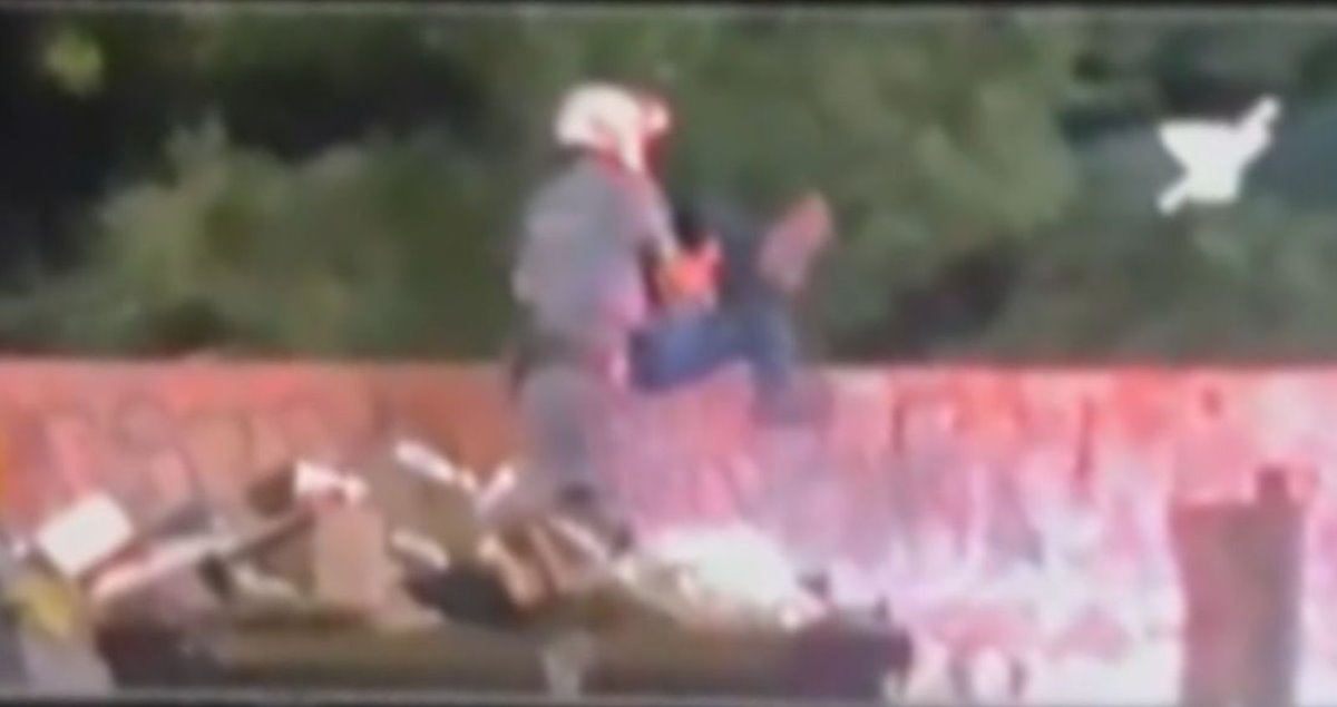 Em seguida, outros dois policiais se aproximam. O primeiro policial move a moto para perto da ponte, enquanto um quarto policial surge segurando pela camiseta azul o homem que teria sido abordado. Ele o leva até a beira da ponte e o arremessa no rio.